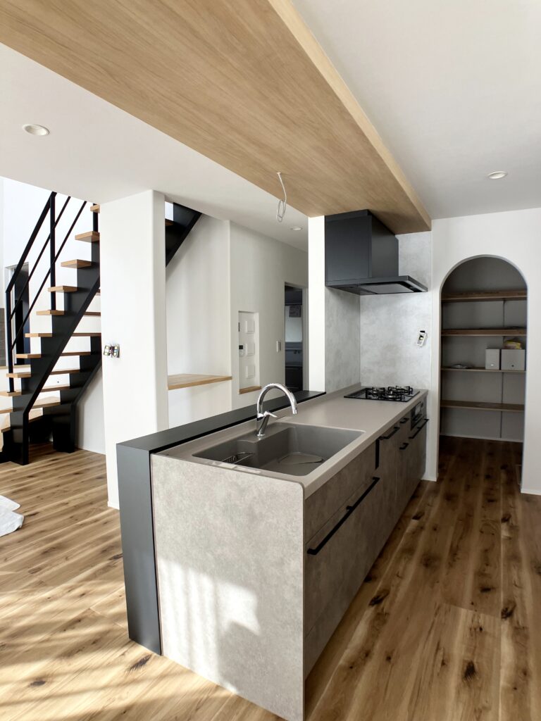 木目と黒とグレーで配色され吹抜けのLDKは大変開放感のある空間に。